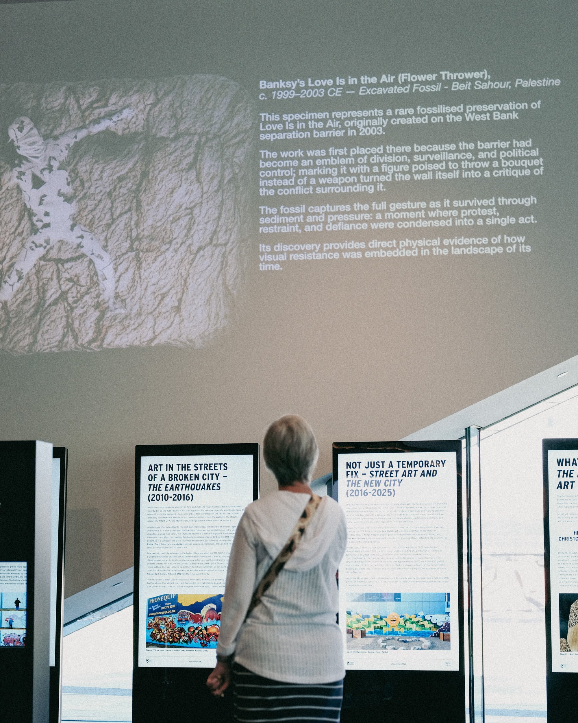 The display includes the Little Street Art Festival’s own Graf Bot by Yeah Creative, alongside Sam Emerson’s digital projection Sediment Record – 2003 CE, which reframes contemporary protest art as an excavated relic, suggesting street art is not just a temporary intervention, but a cultural record.